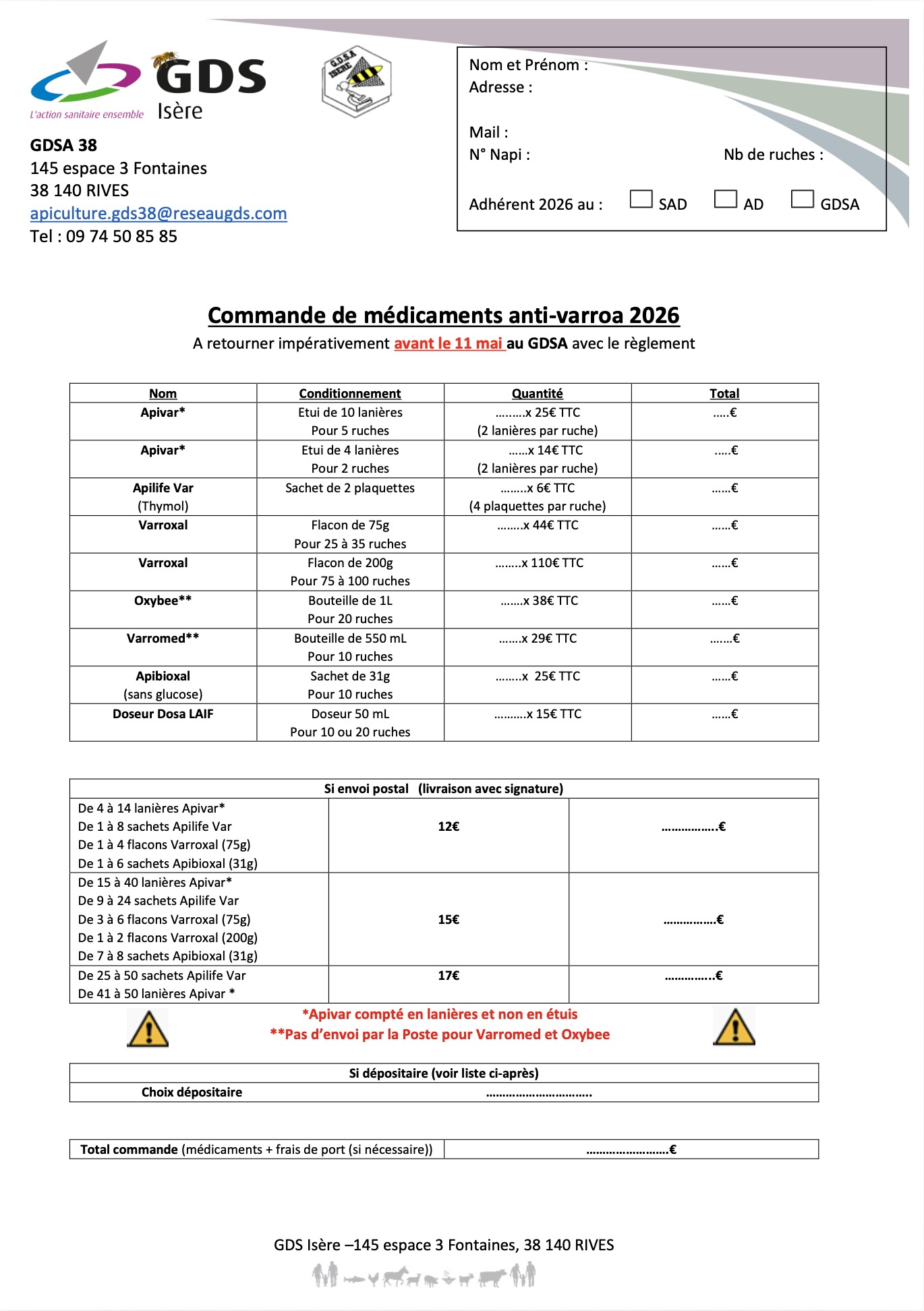 - Commande de médicaments « anti-varroa » à faire avant le 11 mai 2026 -